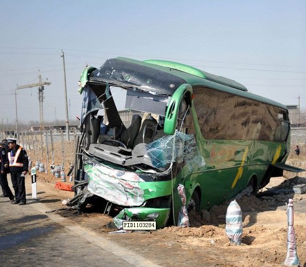 2011年3月16日 山西临汾发生重大交通事故致12人死16人伤 3月16日拍摄的山西临汾重大交通事故现场的客车残骸。 3月16日5时左右,山西临汾市尧都区108国道与霍侯路交叉路口大韩村口发生一起重大交通事故,一辆大型货车与大型客车(核载55人,实载27人)相撞,造成9人当场死亡,3人经抢救无效死亡。事故共造成12人死亡,16人受伤。 目前,事故受伤人员正在紧急救治中,事故原因仍在进一步调查中。