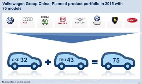 当前大众在华年销量超过200万辆,其中主要为在华合资企业生产的车辆。大众同时也在筹划发力对华出口,例如将旗下西亚特品牌引入中国。根据大众汽车官方发布的资料,到2015年大众将总共有75款车型在中国市场上销售,其中32款为本地CKD组装,43款为进口车,覆盖大众乘用车、奥迪、斯柯达、西亚特、大众商用车、宾利、兰博基尼和布加迪等多个品牌。