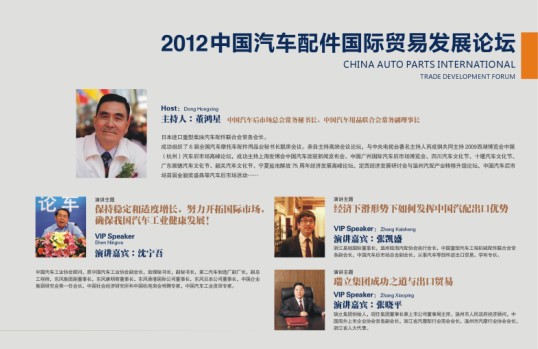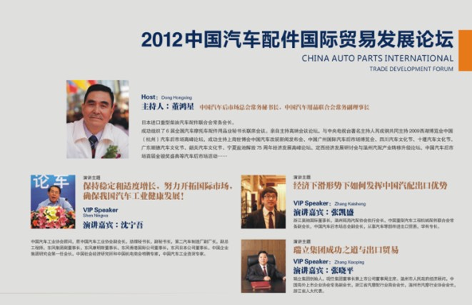 此次论坛邀请到中国汽车行业资深专家沈宁吾;实战经验丰富、从事汽车零部件进出口贸易、学有专长的浙江昊驰国际董事长张凯盛和瑞立集团杰出代表徐本光副总经理作为演讲嘉宾。论坛也得到了东阳市政府的大力支持,他们表示:2012中国汽车配件国际贸易发展论坛为东阳有史以来汽车业最高规格的论坛,希望借助论坛听到汽车资深专家们的指导和建议,使东阳的汽配行业更加发展壮大。