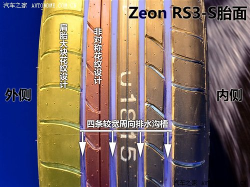 固铂Zeon RS3-S驭动是固铂超高性能轮胎家族中的最新的顶级产品,这款轮胎的特点是提供了超强抓地了和高速稳定性的轮胎。其采用了非对称性花纹设计、方程式高含量硅胶配方和高强度材料、4条较宽周向沟擦槽设计等,轮胎最外层采用了肩胎大块花纹设计,作用是提供了极高的干地抓地力,确保精确的操控和弯道性能。图中红色区域为非对称花纹优化设计,其作用是提供干湿地操控性的同时,还能有效的降低轮胎的噪音。