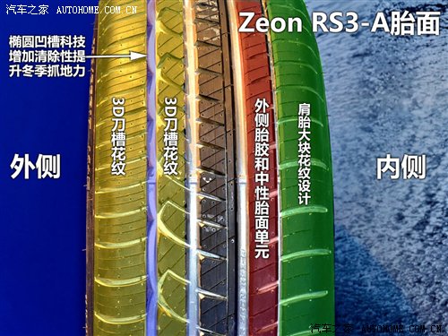 固铂Zeon RS3-A驭行轮胎采用3D刀槽花纹、方程式四季硅胶配方、复合花纹设计、非对称花纹设计等技术。其最内侧采用了肩胎大块花纹设计,提高轮胎在干燥路面的抓地力、提高车辆的操控性和弯道性能。红色部分则为外侧胎胶和中性胎面单元,其作用是同时提高轮胎在干湿地面的操控性能并降低轮胎的噪音。黄色部分为3D刀槽花纹,作用同为增加操控性、过弯的稳定性和减少噪音。至于胎纹之间的椭圆形凹槽则是为了增加清楚性加强轮胎的冬季抓地了,这也是固铂Zeon RS3-A驭行轮胎作为一款全天候四季轮胎的独特设计。