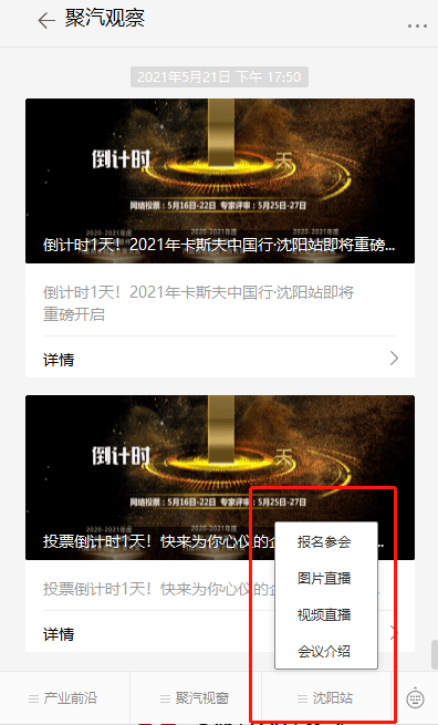 本次会议共设置有两个直播渠道,包括图片直播及视频直播,您可以在 “聚汽观察”公众号主页内获取相关链接: