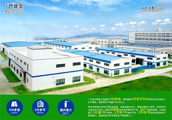 优贝科技拥有占地面积100多亩,建筑面积60000多平方米的现代化专业化工生产基地,配备30余条全自动气雾剂生产线、60个专用色浆釜,打造出逾2.5亿罐/年气雾剂、2万吨/年涂料产品、2万吨/年养护用品的生产制造能力,是国内最大的气雾剂生产制造商之一。