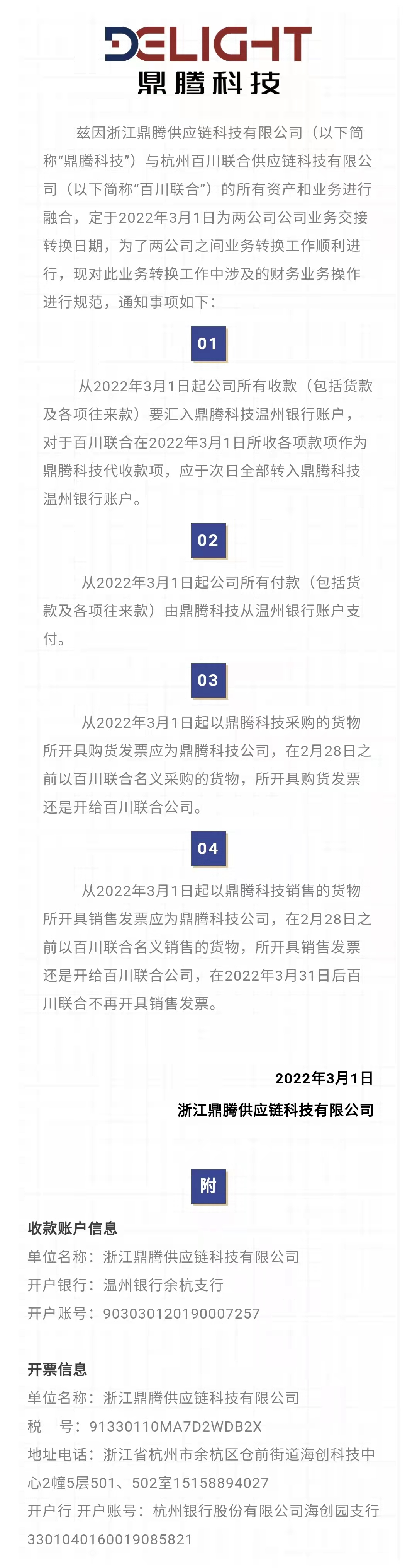 3月16日消息,全车件企业“百川联合”官微发布《关于百川联合与浙江鼎腾业务融合的告知函》,文中表示,为了让两家公司的所有资产和业务顺利完成融合,定于2022年3月1日为两公司公司业务交接转换日期,并对此业务转换工作中涉及的财务业务操作进行规范。