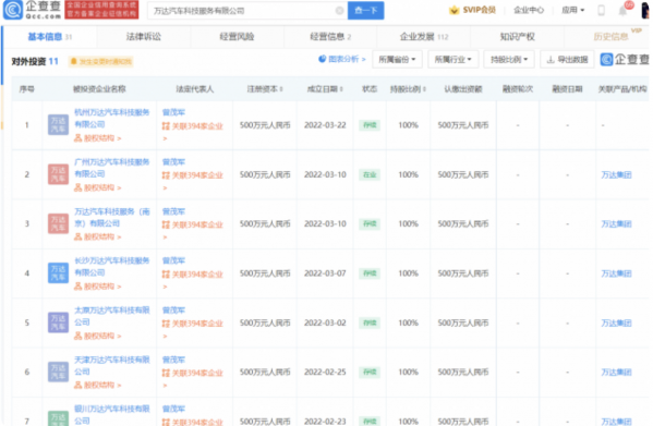 进入2022年,万达集团已先后在北京、沈阳、贵阳、长春、长沙、广州等地成立汽车服务公司。目前,万达汽车科技服务有限公司已在11个城市建立子公司。万达汽车服务公司涉及的经营业务主要也以汽车销售以及后市场服务为主。