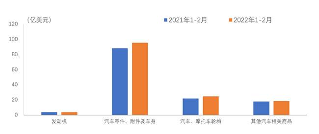 据中国汽车工业协会整理的全国海关汽车商品进出口数据显示,2022年1-2月,我国汽车零部件出口金额142.2亿美元,同比增长8.1%,占汽车商品出口总额的59.2%。在汽车零部件主要出口品种中,与上年同期相比,发动机出口金额略有下降,其他三大类汽车零部件品种均呈增长。