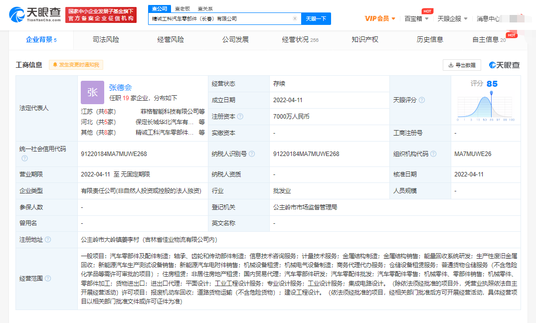 近日,精诚工科汽车零部件(长春)有限公司成立,法定代表人为张德会,注册资本7000万人民币,经营范围包括国内贸易代理;汽车零部件研发;汽车零配件批发;汽车零配件零售;机械零件、零部件销售等。股权穿透图显示,该公司由长城汽车股份有限公司间接全资控股。