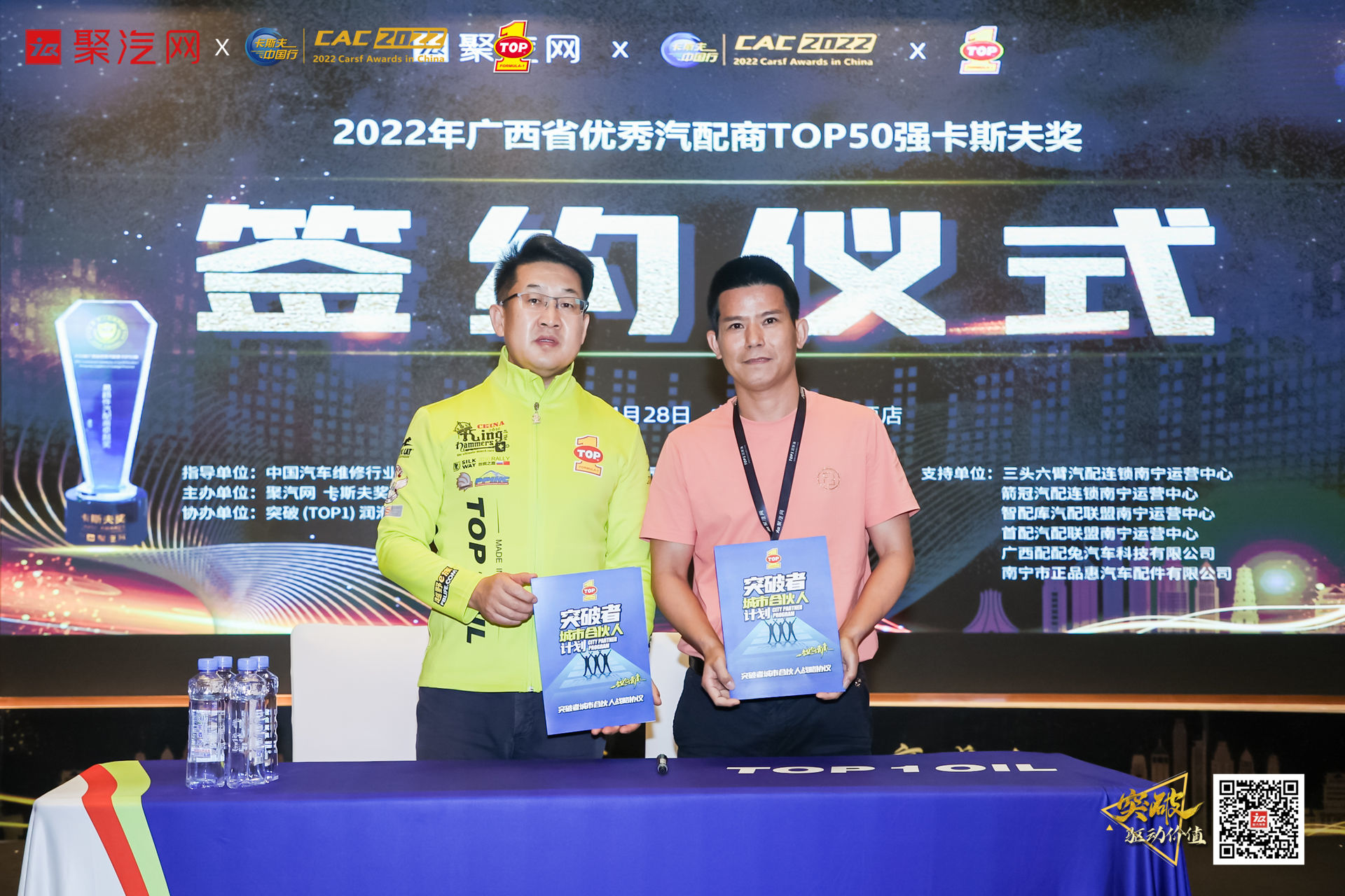 在下午研讨会临近尾声时,活动迎来一波小高潮。在活动现场,多家汽配商与突破(TOP1)润滑油达成了合作,其中南宁市锋胜仕叶商贸有限公司与突破润滑油达成战略合作,突破(TOP1)润滑油大中华区执行总经理李春卿与南宁市锋胜仕叶商贸有限公司董事长叶耀锋上台签订合作,也祝愿两家企业强强携手,实现共赢。