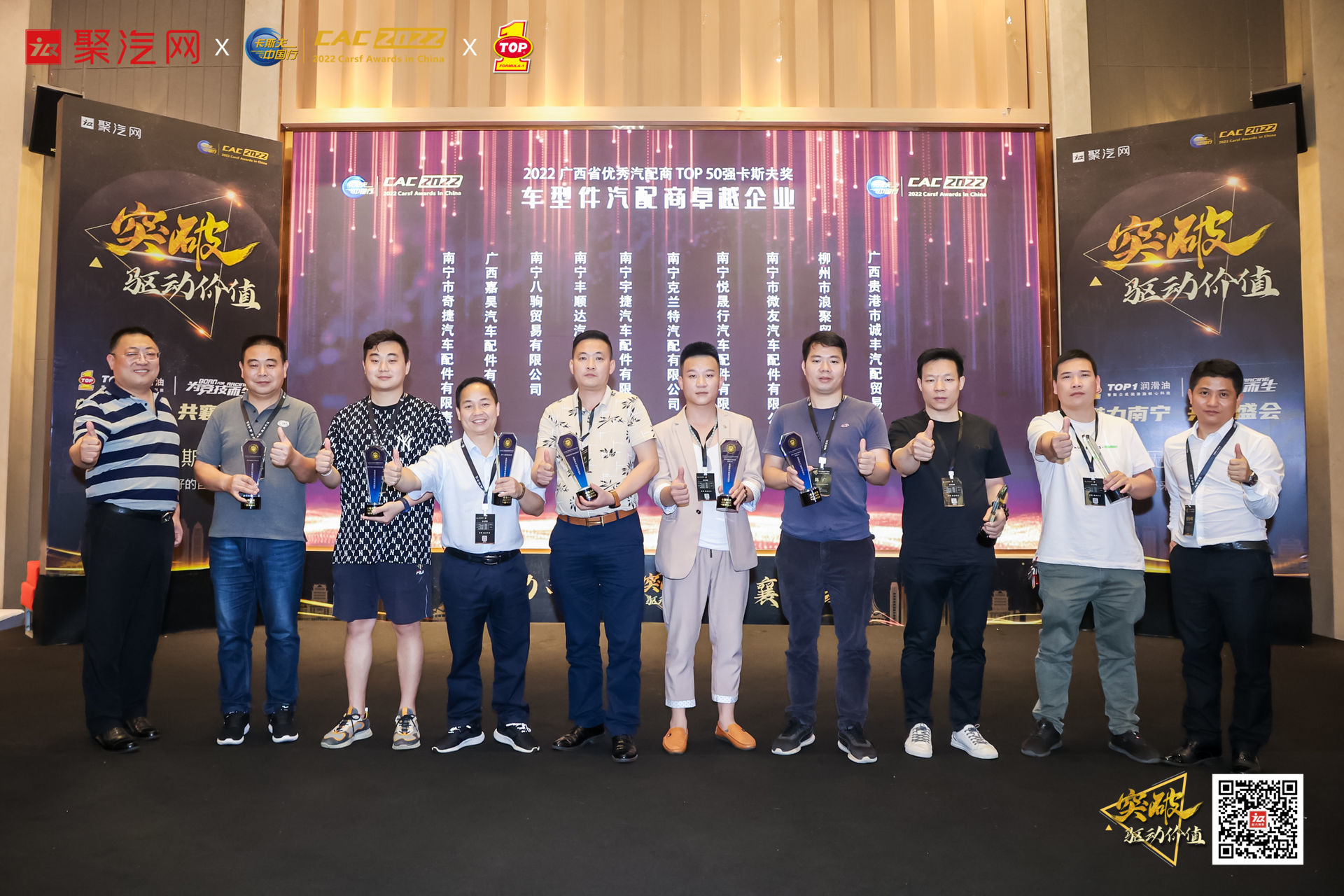 卡斯夫奖作为汽车后市场产业一个颇具含金量的重要奖项,立足中国,服务全球,目的在于奖励过去的一年,在汽车设计、汽车装配、配件研发设计、配件制造、配件经销、汽车维修、数据软件及培训服务等领域为汽车安全(car safety)做出卓越贡献的汽车后市场企业和个人从业者们。已在全国各省评选出优秀汽配商,汽修企业2000余家,深受行业关注及推崇。本次颁奖盛典共奖励10家“2022广西车型件汽配商卓越奖企业”、23家“2022广西易损件汽配商优秀奖企业”、8家“2022广西易损件汽配商卓越奖企业”、3家“2022广西易损件汽配商杰出奖企业”、2家“2022广西修配融合示范先进企业”。