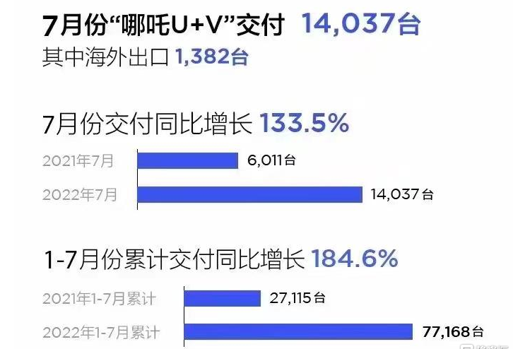 7 月哪吒 V 和哪吒 U 共交付 14037 台(其中海外出口 1382 台),同比增长 133.5%;1-7 月交付 77168 台,同比增长 184.6%。