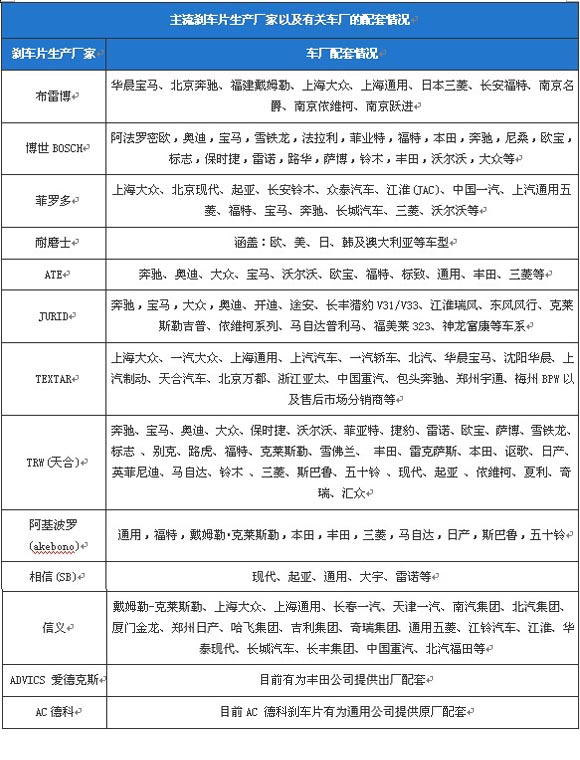 虽然我们不建议自行更换刹车片,但是购买后再在快修店进行更换也是可以的。这里,我们就来具体了解一下主流刹车片生产厂家以及有关车厂的配套情况。