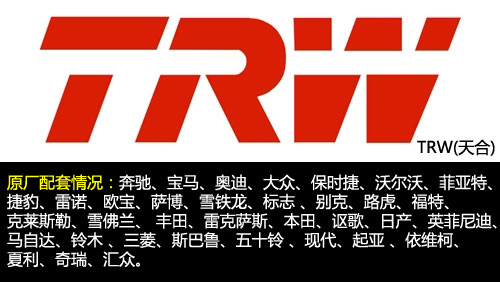 TRW(天合)目标在日系车型,韩系车型以及欧系车型上达到最大的覆盖率。目前配套的车型有 奔驰、宝马、奥迪、大众、保时捷、沃尔沃、菲亚特、捷豹、雷诺、欧宝、萨博、雪铁龙、标志 、别克、路虎、福特、克莱斯勒、雪佛兰、 丰田、雷克萨斯、本田、讴歌、日产、英菲尼迪、马自达、铃木 、三菱、斯巴鲁、五十铃 、现代、起亚 、依维柯、夏利、奇瑞、汇众等。