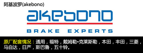 阿基波罗(akebono),日本顶级的刹车片制造厂家,三菱、日产指定配套,为通用、福特、丰田、尼桑等集团提供制动产品。阿基波罗的OEM客户包括:通用,福特,戴姆勒•克莱斯勒,本田,丰田,三菱,马自达,日产,斯巴鲁,五十铃等。
