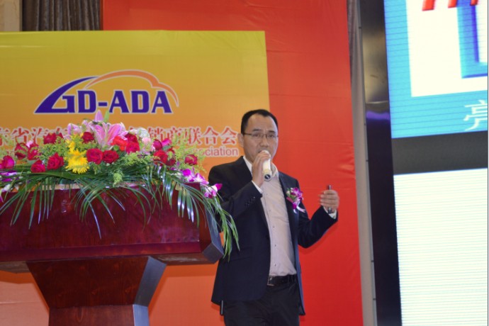 图为褚建林在广东省汽车后市场经销联合会成立大会上受主办方邀请做演讲