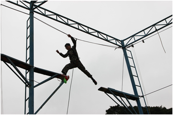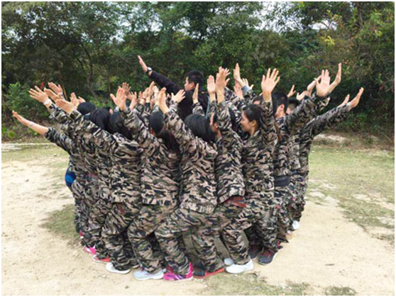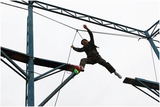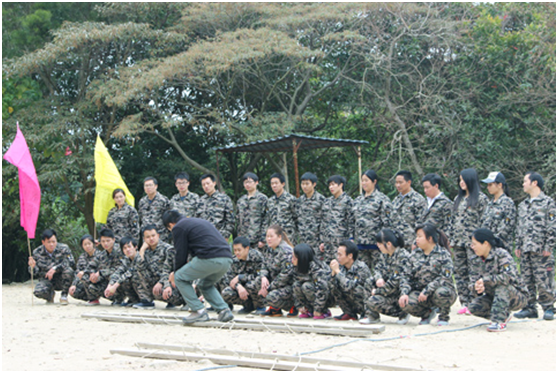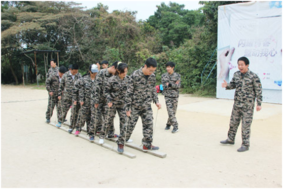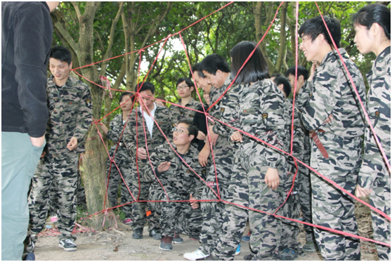 团队合作项目,在全体队员面前悬挂一张“电网”,网上的洞口大小不一,要求学员在40分钟内,从网的一边依次通过到达另一边防。在此过程中队员的任何部位都不允许碰网,否则洞口将被封闭一次。最多可利用三次的洞口,最少的是一次。用完些洞口将被封闭。当没有洞口可用时,需要全体做30个俯卧撑来购买一个洞口。中间过程不允许出任何声音,不然出一次减5分。