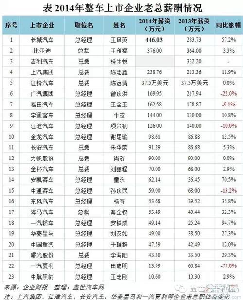 车企老总薪酬:王凤英居首