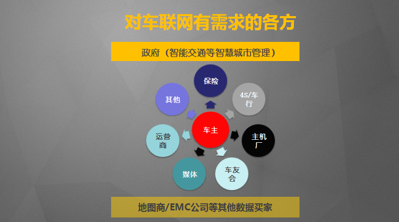 对车联网数据有需求的各方,如果画圈,从内圈走向外圈最核心的是车主,如果我们自己不上网,所有互联网公司都玩不好,而车上网核心就是车主,因为让车上网才会让汽车服务行业有的玩,才有智能交通智慧城市管理。