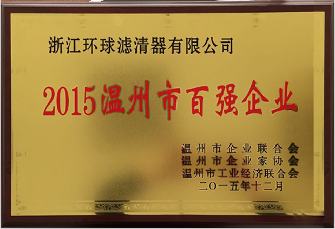 在温州市委、市政府关于转型发展的战略布署下,温州市企业联合会、企业家协会、工业经济联合会(简称“三会”),针对温州市具有法人资格的不同所有制、不同行业的企业,通过自主申报、县(市、区)三会推荐、部门审核,以2014年度企业的温州地区销售收入或营业收入为依据,同时围绕反映企业经营规模和经营成果的主要经济指标(营业收入、净利润、资产总额、所有者权益、研发费用、员工总数等),多层面对2015温州百强企业进行分析比对,浙江环球滤清器有限公司凭借综合竞争力荣获2015年度温州市百强企业荣誉称号。这些也是对环球一直持续进行技术改造、研发投入,采用科学管理的结果。环球将继续努力争取在百强企业名次上不断取得进步。