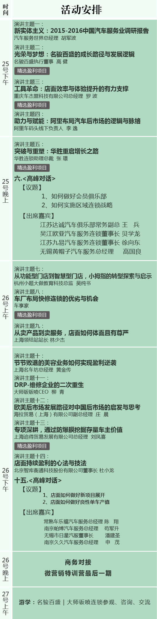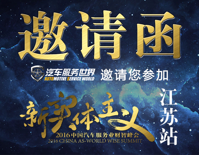 2016 年10月 25-27 日,在苏州白金汉爵大酒店,2016中国(江苏)汽车服务业财智峰会是汽车服务世界3年走遍18省市,财智峰会收官之战,我们将邀请下面四类嘉宾: