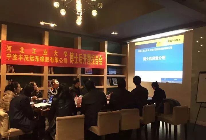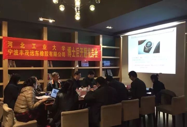 2017年12月12日下午14点,宁波丰茂远东橡胶有限公司与河北工业大学就“BSG张紧器的研究与开发”进行博士后开题报告会议。