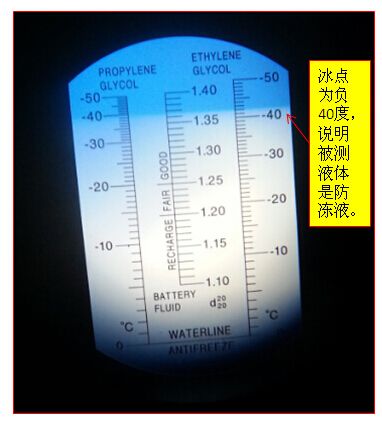 通过测量数据说明点火线圈上的液体是水。再使用测试仪测试防冻液(如图)