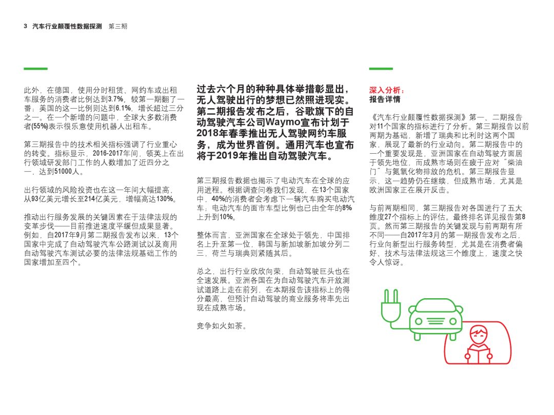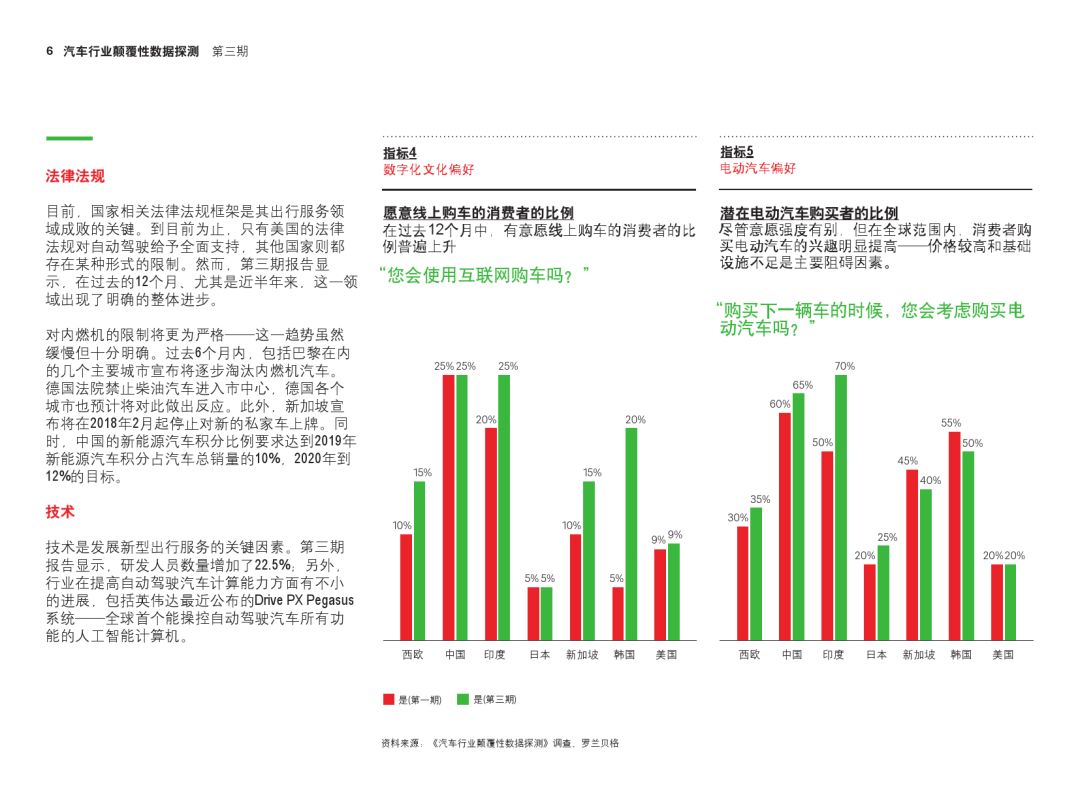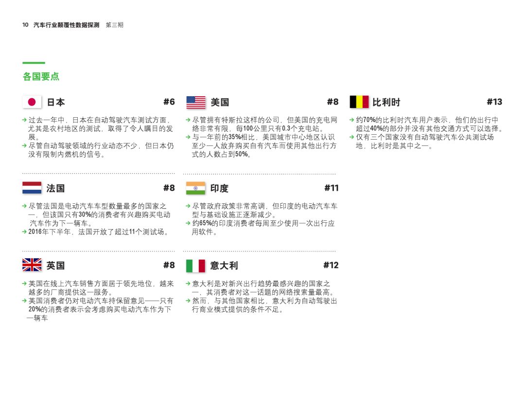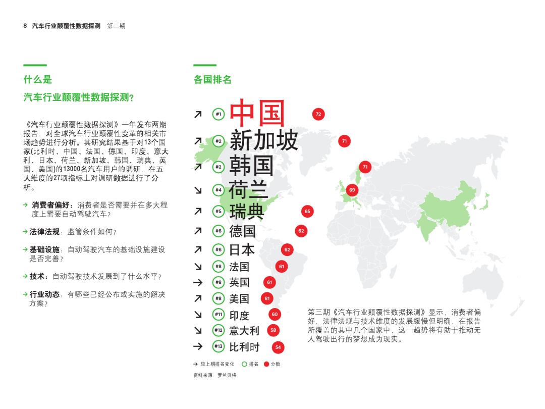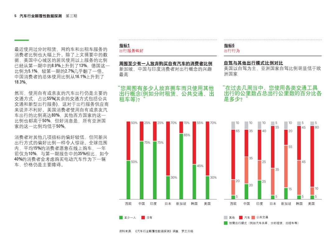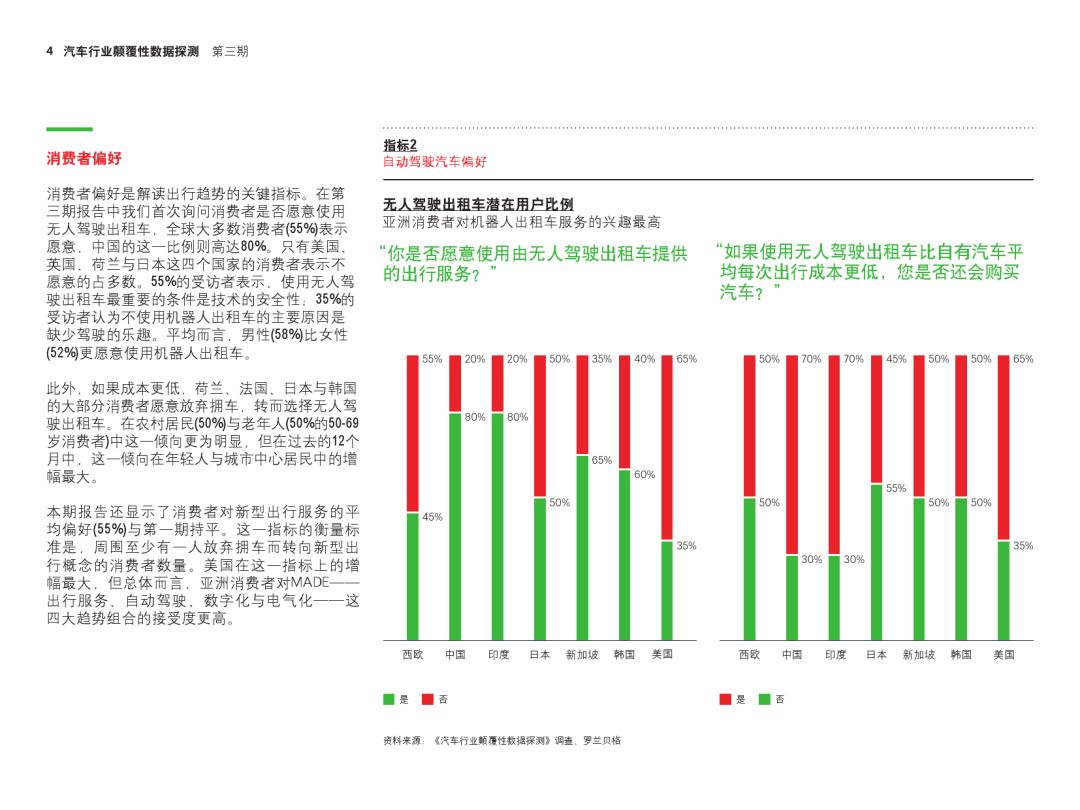 1.各国居民对于自动驾驶服务的热情正在提升,对于出行的方式态度发生转化。对比于第一期报告发布后的12个月内,消费者对于新型出行服务的兴趣激增。以美国为例,如果成本更低,消费者愿意从拥有汽车转向自动驾驶汽车服务的居民数量从10%提高到40%。在中国年轻人中,这一比例为26%。此外,在德国使用分时租赁、网约车或出租车服务的消费者比例达到3.7%,较第一期翻了一番;美国的这一比例则达到6.1%。