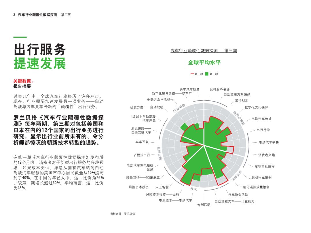在第一期报告中,罗兰贝格认为,未来十几年中,出行服务、自动驾驶、数字化与电气化这四大趋势,将在汽车行业引发重大颠覆性变革。第二期报告中,罗兰贝格基于对全球汽车行业的关键指数监测,为汽车行业在颠覆性变革环境中的决策提供支持与指导。报告发现,全球汽车行业向无人驾驶出行方向的发展速度有一定提升。