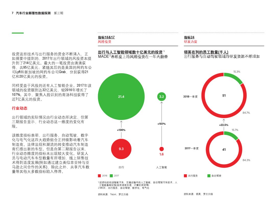 2.报告中技术的相关指标强调了行业重心正在发生改变,从事自动驾驶和出行服务领域的人才正在增加。2016-2017年间,领英上在出行领域研发部门工作的人数增加了四分之一,达到51000人。出行领域的风险投资也从93亿美元增长至214亿美元,增幅为130%。