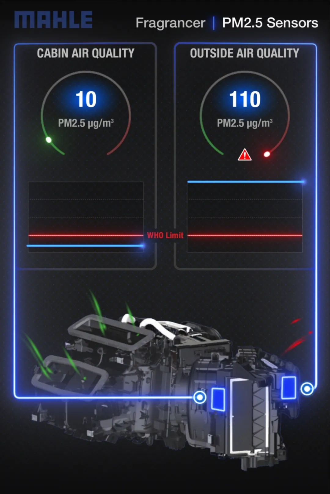 除创新的传感器理念以外,马勒还开发出了新一代的细颗粒物空调滤。该空调滤在整个寿命周期内都展现出稳定而高效的杂质隔离能力,从而长久保持车厢空气清洁。不管是细小颗粒物、固体微粒,还是有害气体、环境异味,都被拒之车外。常见颗粒物包括前车扬起的刹车粉尘、燃油煤烟、橡胶轮胎屑等等。集成在马勒智能空调中的传感器同时也有助于延长滤芯的使用寿命。此外,该空调滤还能使空调内部零部件免于暴露在脏空气中。