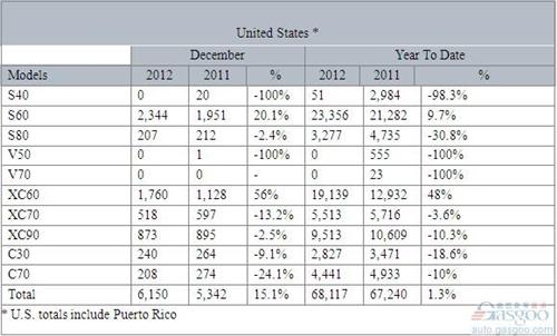 2012年12月,沃尔沃汽车在美国销量为6,150辆,2011年12月销量为5,342辆,同比增长15.1%。这也是2007年以来,沃尔沃汽车在美国市场最佳12月销量业绩。2012年全年,沃尔沃汽车在美国销售了68,117辆汽车,较之2011年的67,240辆同比提升1.3%。