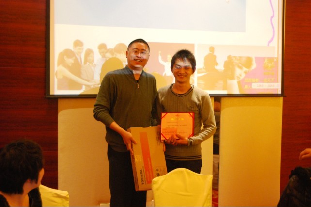 图为:上海久真汽车配件有限公司总经理干斌为销售第一名:上海莹豪汽配颁奖