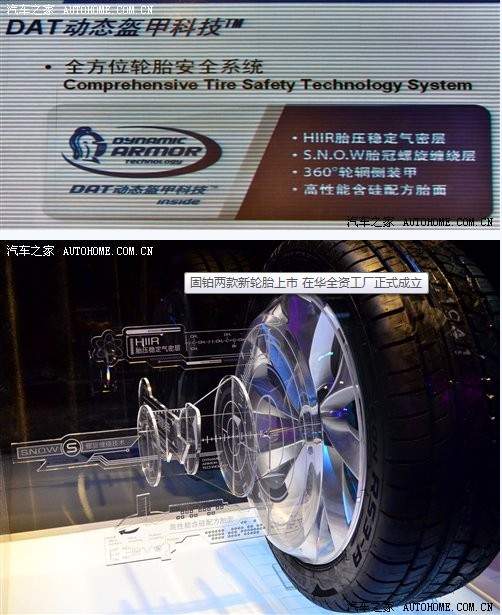 动态盔甲科技Dynamic Armor Technology是固铂轮胎首创的一个轮胎安全技术,其主要包含了四个方面的内容,分别为:HIIR胎压稳定气密层、S.N.O.W胎冠螺旋缠绕层、360度轮辋侧装甲和高性能含硅配方胎面。