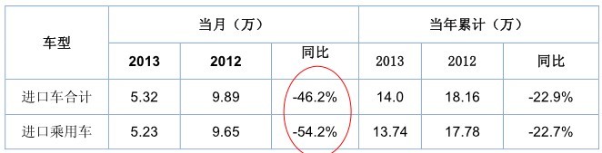2013 年 1-2 月,累计进口乘用车为 13.74 万辆,同比下滑22.7%。