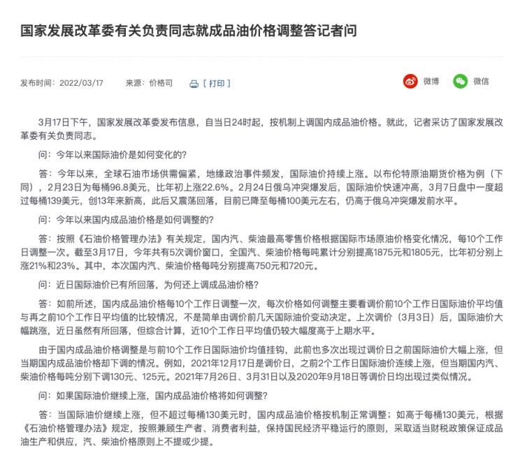 答:按照《石油价格管理办法》有关规定,国内汽、柴油最高零售价格根据国际市场原油价格变化情况,每10个工作日调整一次。截至3月17日,今年共有5次调价窗口,全国汽、柴油价格每吨累计分别提高1875元和1805元,比年初分别上涨21%和23%。其中,本次国内汽、柴油价格每吨分别提高750元和720元。