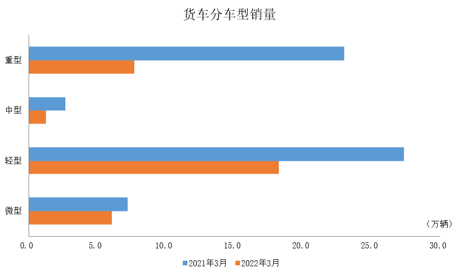 2022年3月,在货车细分品种中,与上月相比,微型货车产量呈较快下降,销量明显增长,其他三大类货车品种产销均呈增长;与上年同期相比,四大类货车品种产销呈不同程度下降,其中重型货车降幅更为明显。