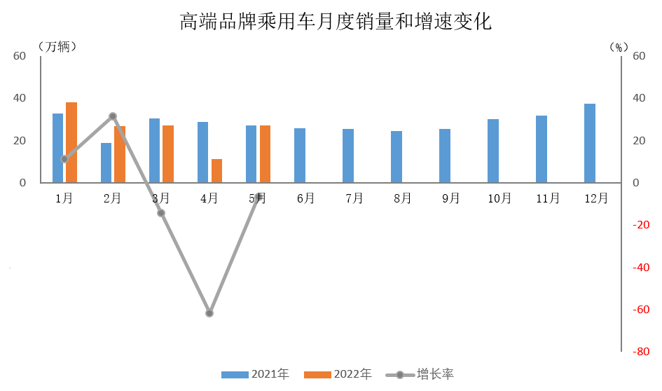 2022年5月,1-5月,国内生产的高端品牌乘用车销量完成131.3万辆,同比下降9.4%,降幅大于乘用车总体。