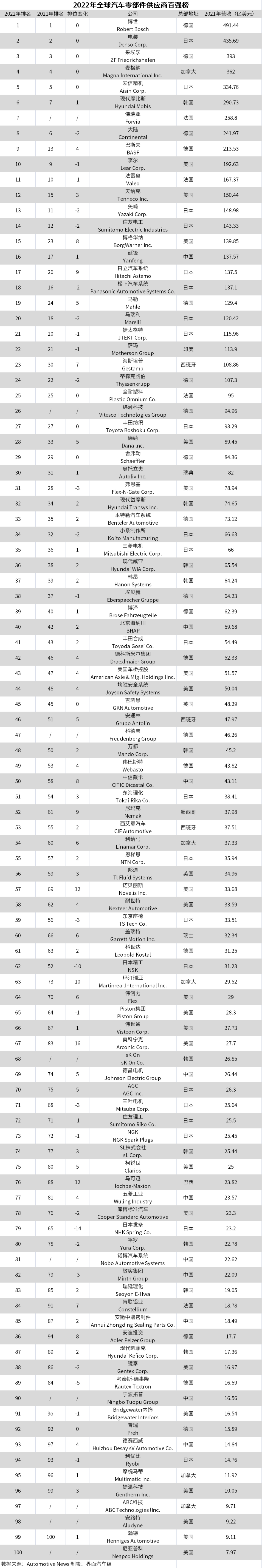 2022年全球汽车零部件供应商百强榜