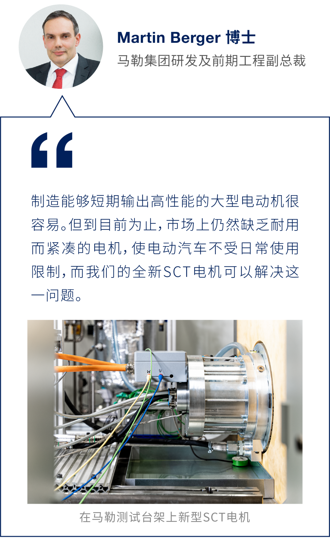 在设计产品时,马勒集团选择了永久励磁电机,因为这种类型可以实现非常紧凑的设计,没有能量必须转移到转子作为“励磁电流”。这使得电机高效和无磨损。钕磁铁是目前可以产生的最强的永久磁铁,应用于电机里产生磁场。然而,为了获得对原材料价格和地缘政治发展的更大的独立性,SCT电机也可以设计为没有磁铁,从而以获得更大的独立性。这要归功于马勒集团研发的独特的非接触式变压器,这种无磁体电机也将是无磨损且高效运行,只是需要稍微多一点的安装空间。