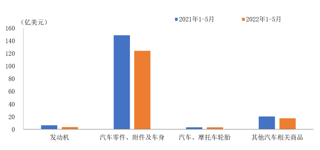 2022年1-5月,我国汽车零部件进口金额147.9亿美元,同比下降17.1%。在汽车零部件主要品种中,与上年同期相比,汽车、摩托车轮胎进口金额保持小幅增长,其他三大类零部件品种均呈下降。