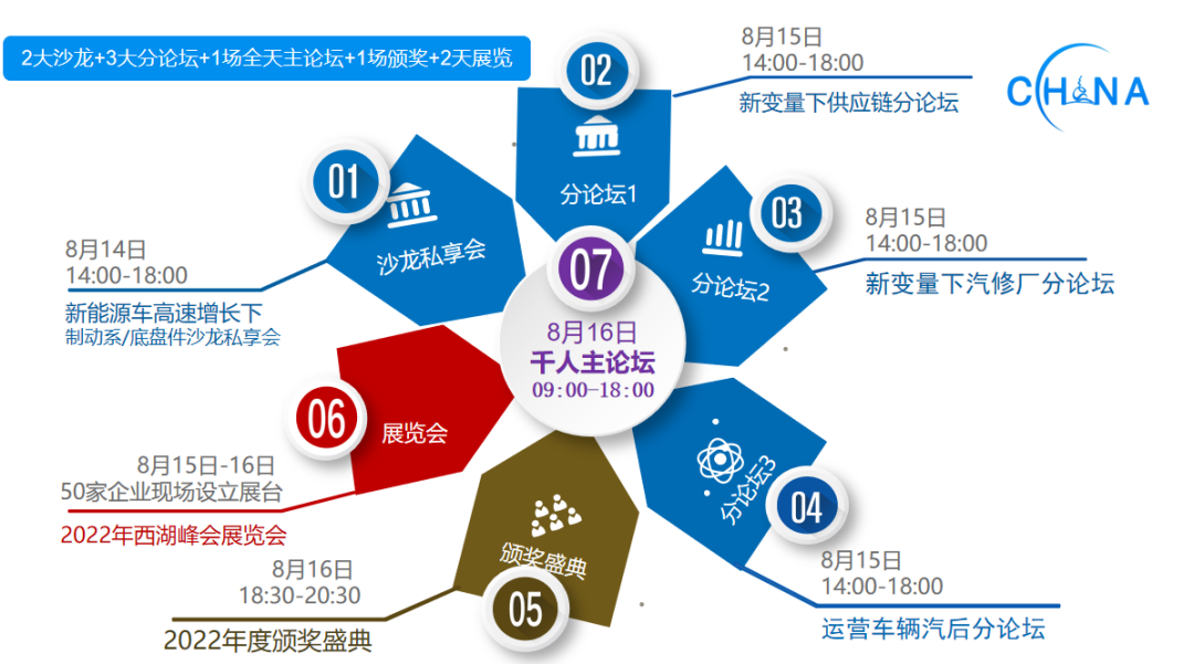 2022年疫情此起彼伏,汽车后市场产业发展机遇与危机并存,如何实现差异化、高质量发展,离不开行业人士的共商共讨共聚。时至暑月,岁至年中,第五届汽后西湖峰会如约而至。由聚汽网和卡斯夫奖组委会联合主办,兹定于2022年8月15-16日召开第五届汽后西湖峰会,大会为期两天,制定了丰盛的峰会环节与活动内容。
