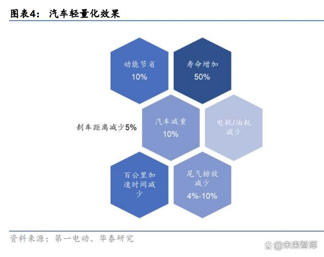 汽车轻量化应用优势显著,解决汽车能源消耗+续航焦虑+提高性能的痛点需求。我们认为轻量化兼顾提升续航和汽车性能,迎合了驾驶舒适性/安全性/经济性的要求,在需求端刺激下有望打开市场广阔空间。电动车质量比燃油车高100-300kg,将消耗更大比例的能量用于负荷自重,而每减重10kg可提升2.5km的续航,并可降低20%的电池成本和日常损耗成本。同时轻量化显著优化了汽车操作性能及安全性能,并缩短了汽车开发时间。整车开发需针对噪声、振动与声振粗糙度等NVH问题优化设计,而铝合金零件较钢制零件降低了汽车对减震消音部件的要求,从而缩短了因针对NVH问题的调试时间。我们以铝合金轻量化为例,在能耗方面,单车使用60kg铝,可降低0.69L/100km的油耗,降低0.75Kwh/100km的电耗。