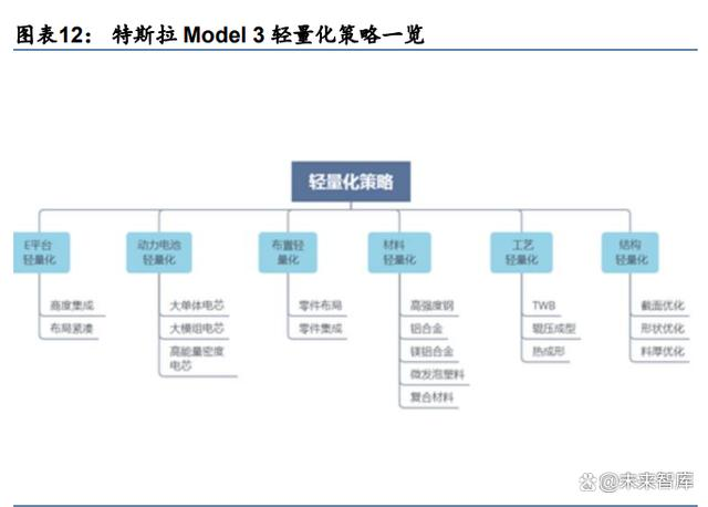 1)特斯拉:作为新能源车头部持续加码新能源车轻量化,电池包和车身轻量化为重点。以Model3为例,其轻量化从电池包开始逐步拓展到车身、底盘、电子电器,整车轻量化指数在竞品中较突出。具体措施包括,采用高集成化的E平台、提升电池密度减少电芯数量、优化电池连接工艺来减少铝片用量、采用大模组设计减少组件连接件、优化电池包箱体结构、使用钢铝结合的车身、使用全铝线束、开发一体化压铸车身结构件等。
