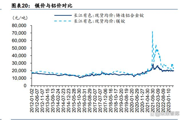 远期看,随着镁合金加工技术成熟、生产成本降低,轻量化效果更优的镁合金未来或得更多应用。镁的密度为铝的2/3、钢的1/5,是目前较轻的金属结构材料,车身/动力总成/底盘/内饰使用镁合金替代铝材最高可减重约50%。往后看我们认为,高性能镁合金加工工艺的日趋成熟或降低镁合金的生产成本,同时现有镁合金铸件应用范围与铝合金铸件的重叠度不断扩大,远期看镁合金有望替代铝合金成为重要的汽车轻量化材料。