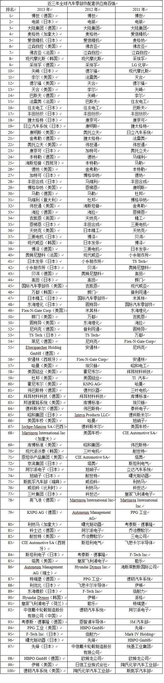 下表为近三年全球汽车零部件配套供应商百强榜单: