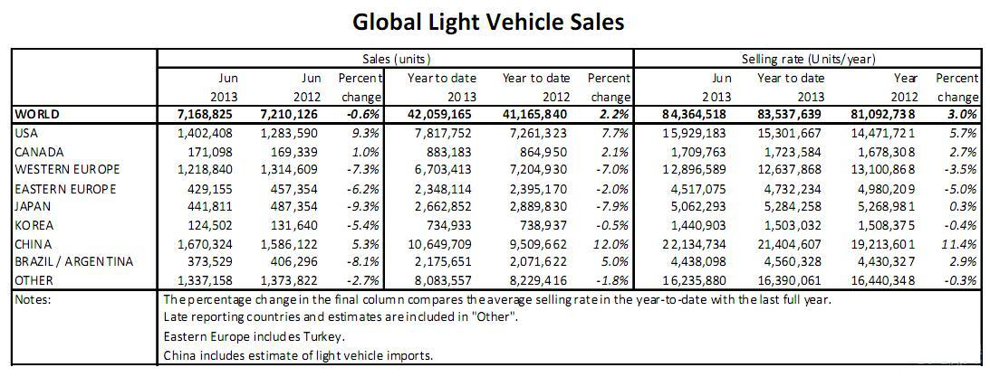 据LMC Automotive公司日前发布的数据,2013年6月全球轻型车销量同比略下滑0.6%至716.9万辆,上半年全球轻型车销量约为4,206万辆,同比增长2.2%。