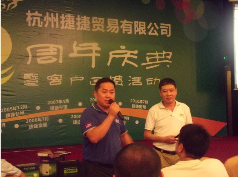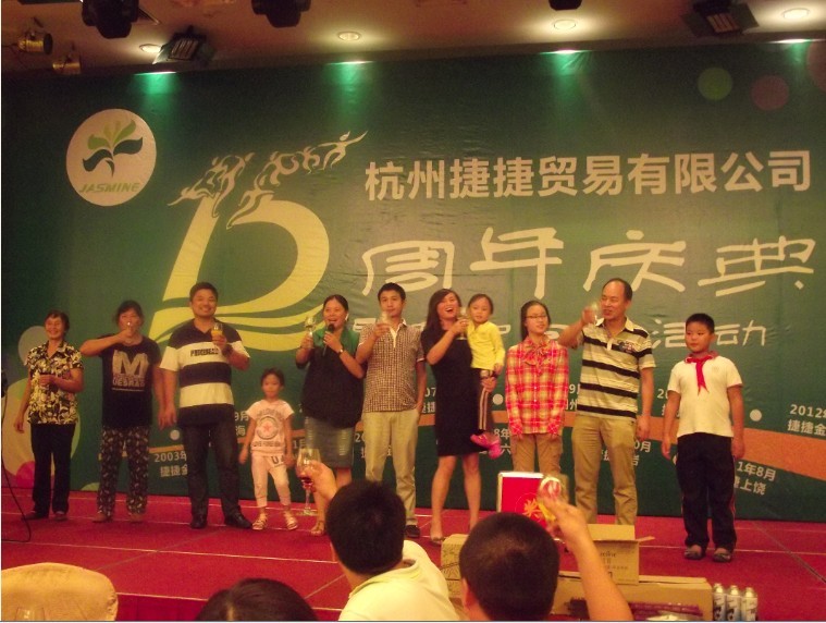 随后总经理叶丽琴,副总经理叶丽梅再次走到舞台中央,她们张嘴讲话中带着哽咽,她们三姐妹从金华来到杭州创立捷捷,三姐妹齐心协力,克服重重困难,立足杭州,走向华东,服务全国,分别在上海、温州、金华店、台州、宁波、衢州、金通、湖州、江西上饶、金恒德、福建龙岩开设分店。一个成功的女人背后定有一个伟大后援团,当随着音乐的起动,两姐妹把家人团邀请到舞台时,拥抱而泣而喜,场下顿时响起热烈般的掌声。