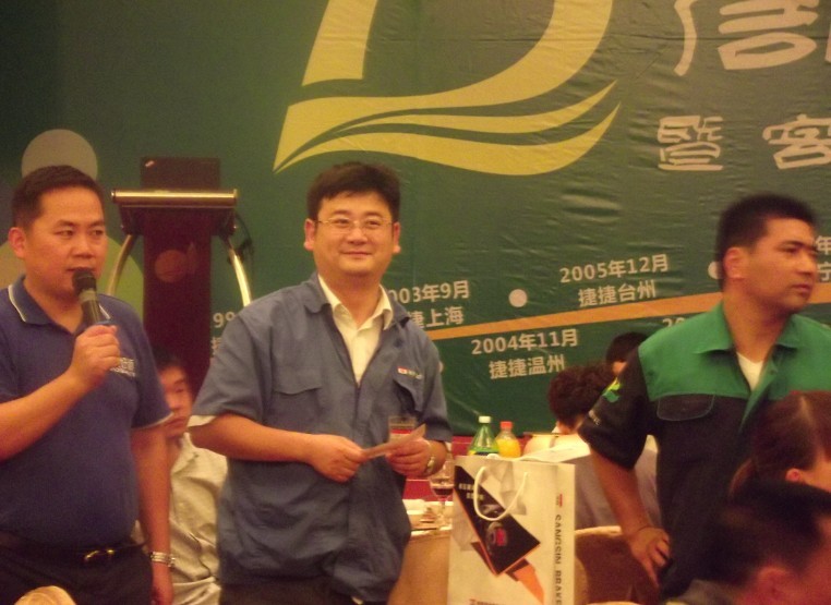 捷捷在15年的经营中,取得了有目共睹的辉煌成就,但成绩的背后凝聚了无数人默默的支持及鼓励。会议中首先由叶丽琴总经理领着在会场的40位员齐步走到讲台一致向来到会场的经销商客户、修理厂客户、4S店用户鞠躬表示感谢,正是因为广大客户的支持,合作才会有捷捷今天的成绩。