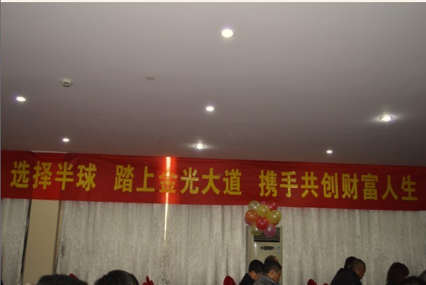 步入酒店迎来杭州半球公司各式喜悦的装扮,诸如欢迎杭州半球全国优秀经销商载誉归来、杭州半球2013年财富论坛、五彩缤纷的旗帜迎风而舞,杭州半球公司的工作人员热情有素的张罗接待,步入会议厅,一股人潮热气迎面扑来,舞台右侧一堆礼品,从IPHONE5S、IPAD、联想笔记本电脑、佳能摄影机、佳能照相机、蚕丝被、奔腾电饭锅、电吹风、飞科剃须刀等礼品。