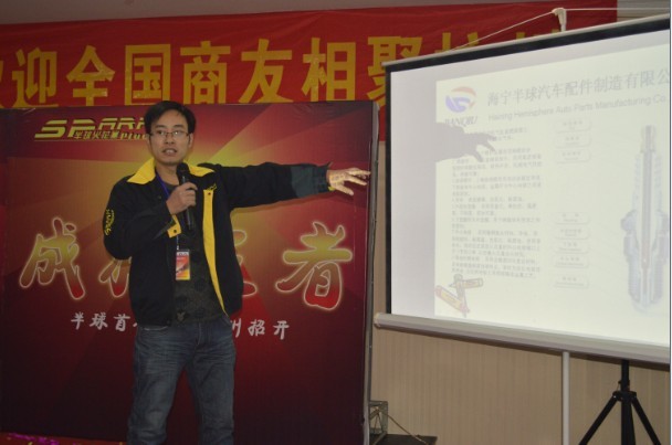 随后杭州半球汽车配件有限公司汤传玉副总细细阐述了2014年公司发展理念及发展纲领。他在讲话中讲到1、强调和突出销售的主导地位,在杭州设立产品营销中心,统筹负责全国区域经销商以及出口贸易、实现半球年度制定的各项销售任务;2、加强研发和技术创新,努力提升产品的核心竞争力;3、科学安排,努力实现产品品种的多元化;4、通过各种方式在全国范围内扶持经销商:1)、继续以优惠的价格向经销商供货;2)、继续做好年度促销及返利工作;3)、做好售后服务工作,对质量进行三包;4)、对单次超过相应金额的发货承担运费;5、调整公司组织结构,为企业的健康发展做出组织保障;6、健全公司制度建设,实现企业可持续发展。