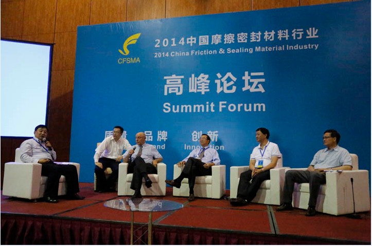 2014年5月19日,中国摩擦密封材料协会以“质量、品牌、创新”为主题,举办了“2014中国摩擦密封材料行业高峰论坛”。高峰论坛由王耀理事长主持,美国SAE制动年会主席Roy Link、美国资深密封材料专家高冠英、珠海格莱利摩擦材料有限公司董事长刘翌辉、浙江国泰密封材料股份有限公司常务副总经理、总工程师吴益民等四位国内外对经营、管理、技术、品牌建设上有真知灼见的企业高级管理者和行业资深专家在台上就座并做主旨发言。